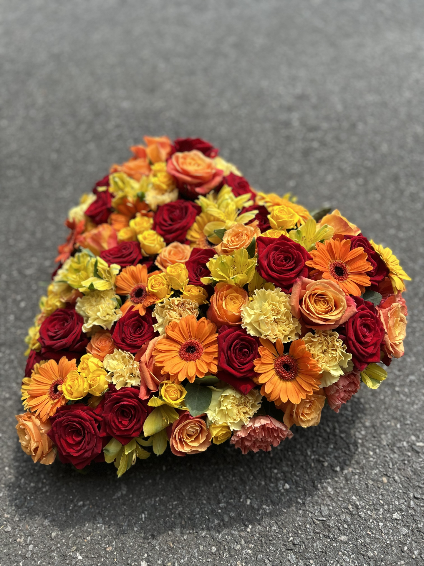 Composition en forme de coeur composée de roses rouges, oranges, jaunes, germinis oranges, oeillets jaunes.