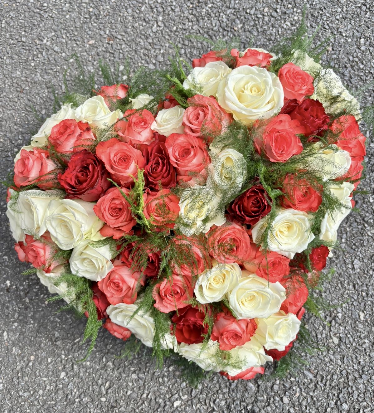 Composition en forme de coeur composée d’un assortiment de roses et d’asparagus