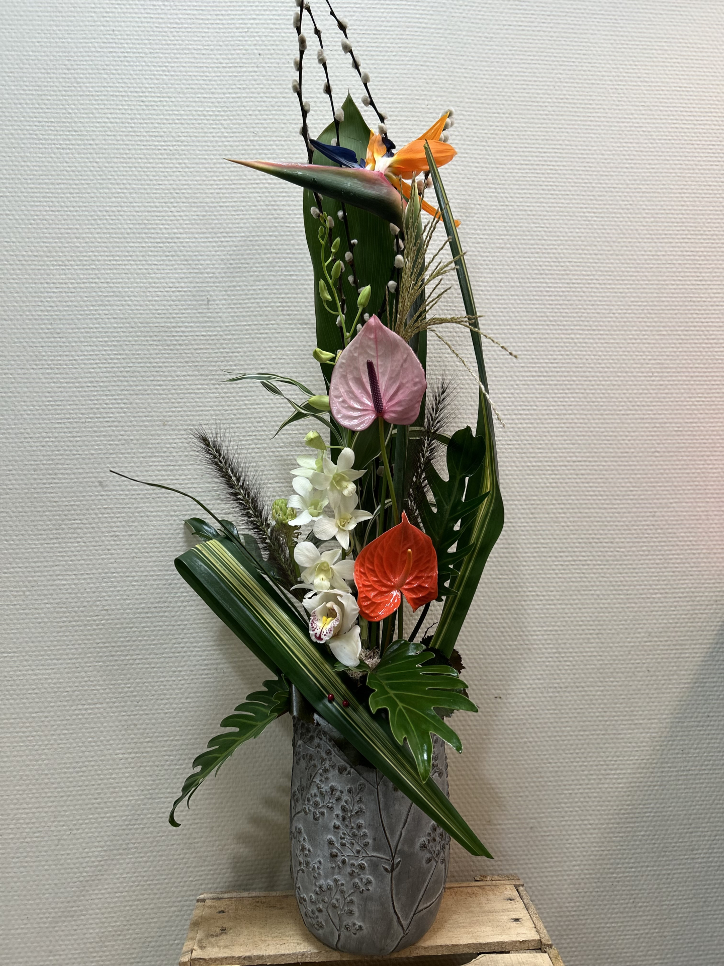 Composition en hauteur composée d’anthurium, vanda, strelitzia