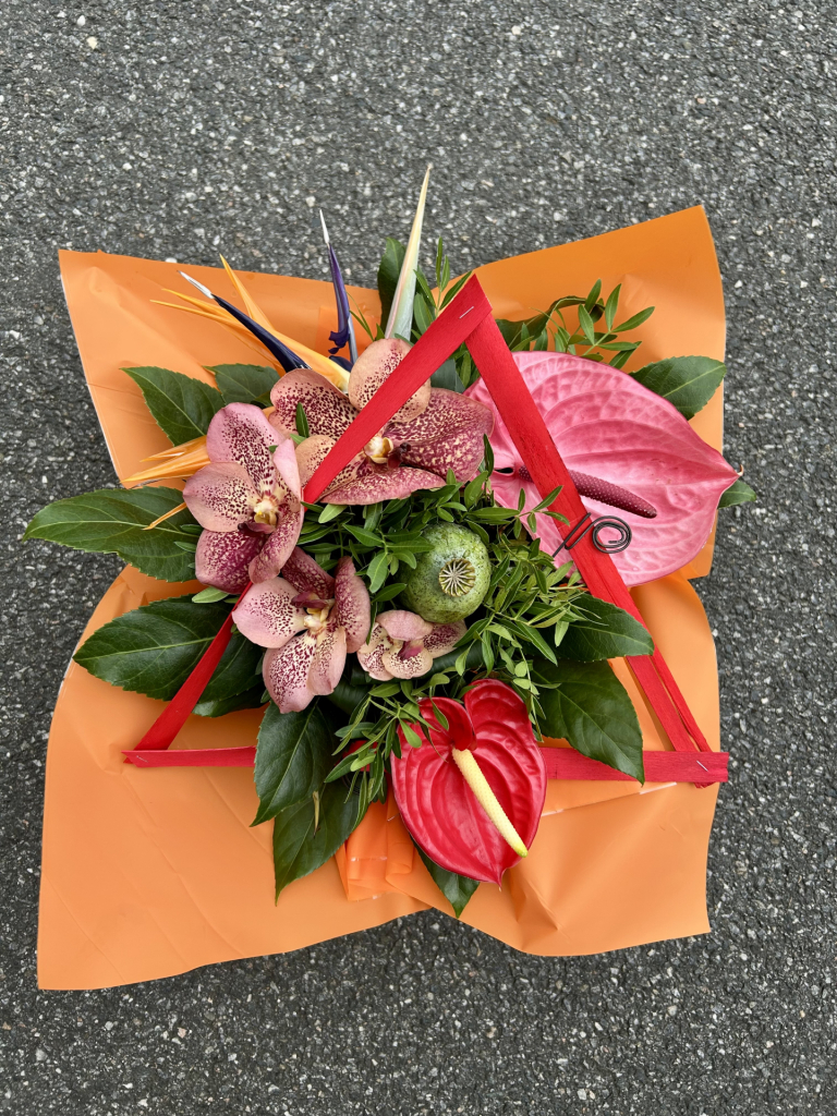 Centre de table aux couleurs cirantes, composé de Germinis fuchsias, de Craspédias jaunes, de Giroflées, de Dahlias blancs, et de Callas Oranges, accompagné de différents feuillages