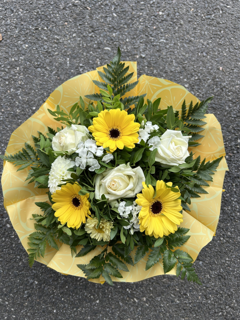 Composition en forme de coeur composée de Roses rouges et blanches, accompagnée d’Asparagus verts