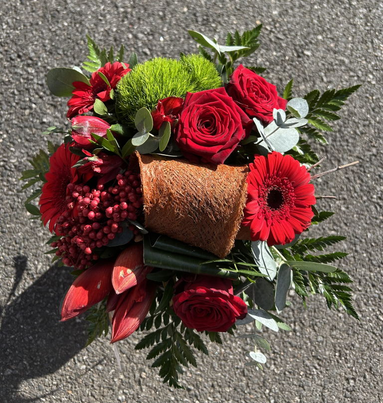 Devant de tombe composé de Glaïeuls fuchsias, de Dendrobiums violets, de Tournesols, de Germinis jaunes, de Callas jaunes, de Santinis verts et d’Hypéricums rouges, accompagné de différents feuillages