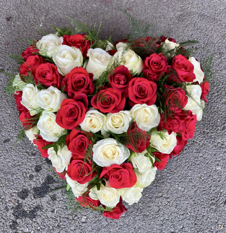Composition en forme de coeur composée de Roses roses, d’Oeillets roses , de germinis, lisianthus et freesias
