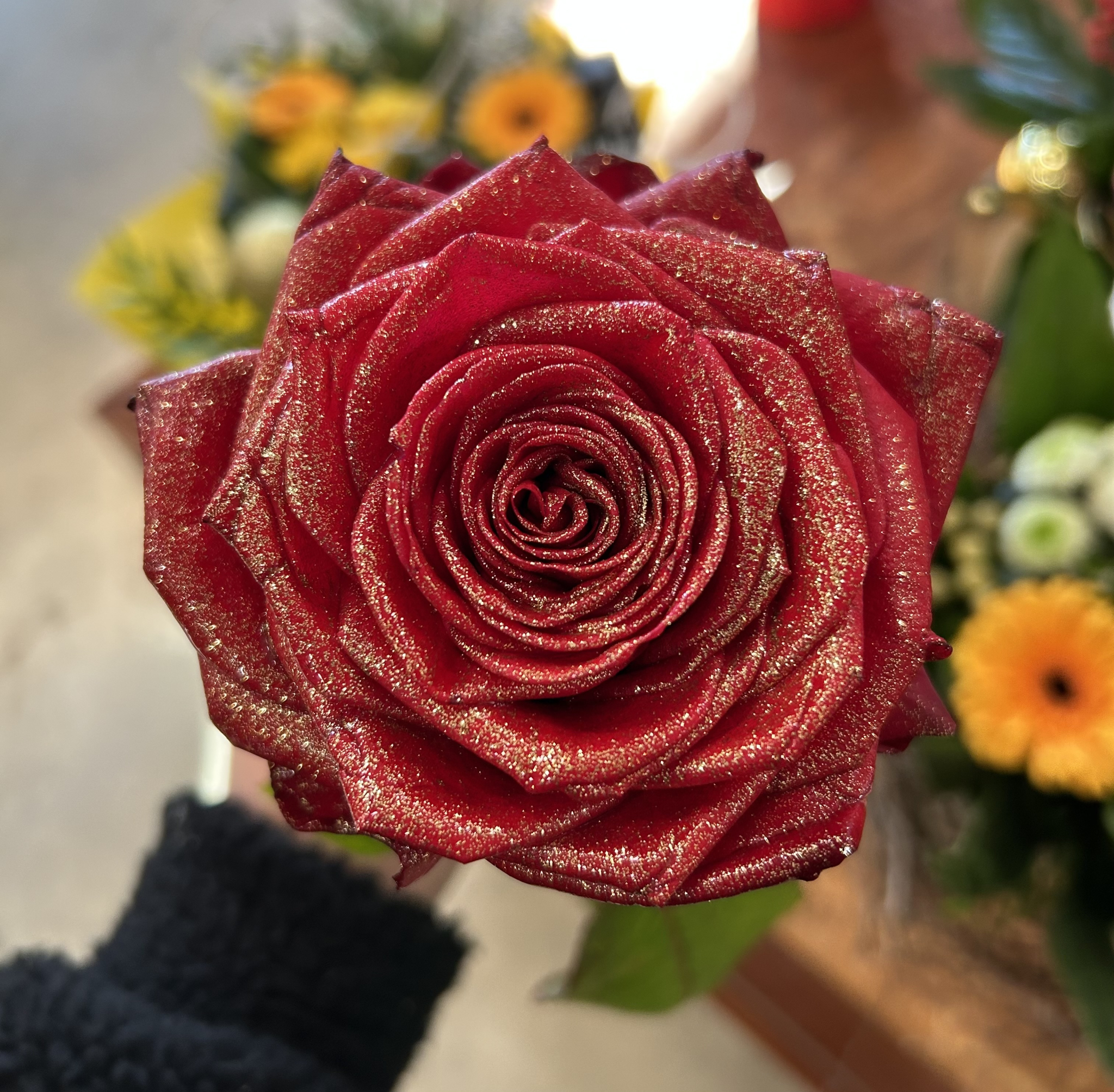 Rose pailletée, durée limitée durant les fêtes.